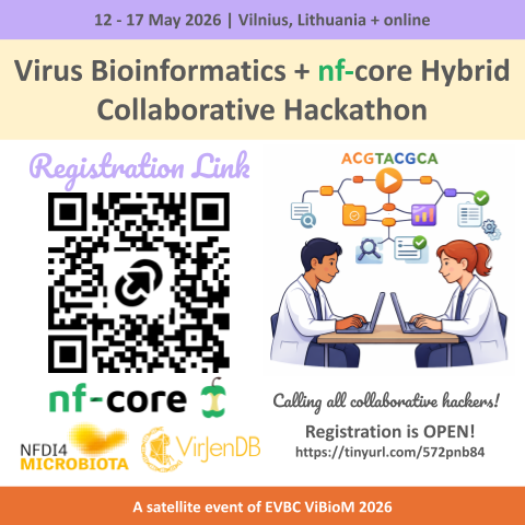 The VirJenDB (NFDI4Microbiota) and the global nf-core community share a commitment to building open-source bioinformatics workflows (for example, in Nextflow) to enable reproducible research. We organize a collaborative hackathon as a satellite event of the International Virus Bioinformatics Meeting 2026. You do NOT have to attend ViBioM to participate in the hackathon. We invite you to join us on 12-17 May online and/or on 17 May in person in Vilnius!